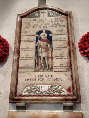 TO THE GLORY OF GOD/ AND IN LOVING MEMORY OF/ THE MEN OF THIS CHURCH/ WHO FELL IN THE GREAT WAR/ 1914 1918/ RANK, NAMES, REGIMENTS/ THEIR NAME/ LIVETH FOR EVERMORE/ RIP