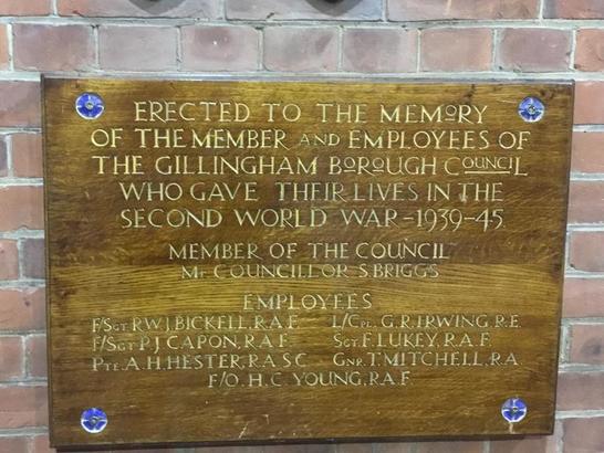 ERECTED TO THE MEMORY / OF THE MEMBER AND EMPLOYEES OF / THE GILLINGHAM BOROUGH COUNCIL / WHO GAVE THEIR LIVES IN THE / SECOND WORLD WAR - 1039 - 45. / MEMBER OF THE COUNCIL / (name) / EMPLOYEES/ (names)