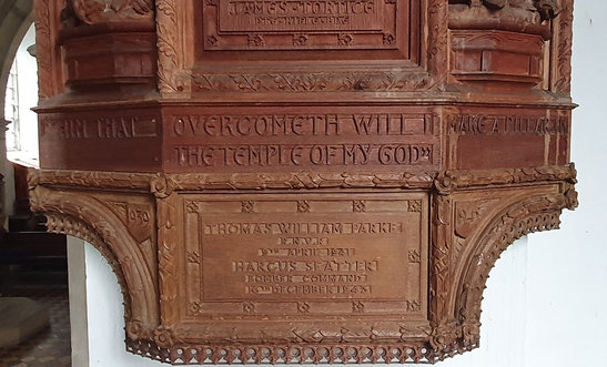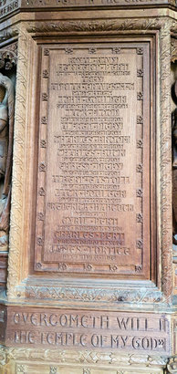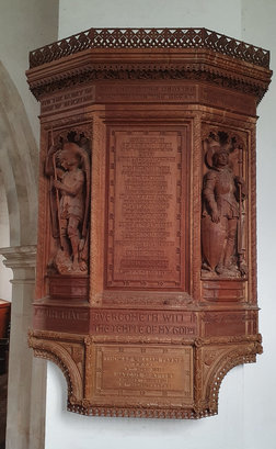 TO THE GLORY OF GOD AND IN UNDYING MEMORY OF THE / MEN OF BLICKLING WHO FELL IN THE GREAT WAR 1914 - 1919 / (WW1 Names) / “HIM THAT OVERCOMETH WILL I MAKE A PILLAR IN / THE TEMPLE OF MY GOD” / (WW2 Names) //