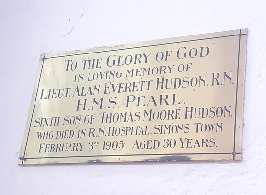 TO THE GLORY OF GOD / IN LOVING MEMORY OF / LIEUT. ALAN EVERETT HUDSON. R.N. / H.M.S. PEARL. / SIXTH SON OF THOMAS MOORE HUDSON. / WHO DIED IN R.N. HOSPITAL. SIMONS TOWN / FEBRUARY 3RD 1905. AGED 30 YEARS.