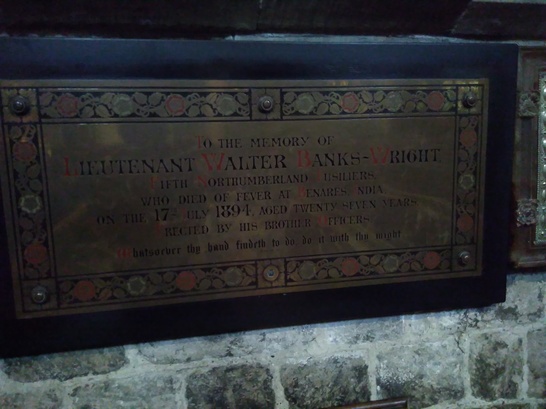 To the memory of Lieutenant Walter Banks-Wright Fifth Northumberland Fusiliers who died of fever at Benares, India on the 17th July 1894, aged twenty seven years Erected by his brother officers Whatsoever thy hand findeth to do, do it with thy might