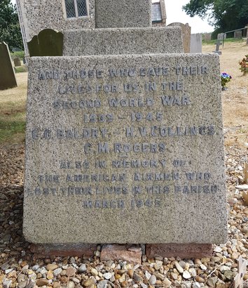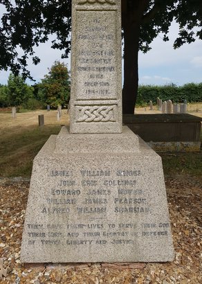 On stem of Cross: IN / GRATEFUL / MEMORY OF THE / FIVE / SOUTH COVE MEN / WHO MADE THE / SUPREME SACRIFICE / IN THE / GREAT WAR / 1914 - 1919 / On south face of base: (Names) / THEY GAVE THEIR LIVES TO SERVE THEIR GOD / THEIR KING, AND THEIR COUNTRY IN DEFENCE / OF TRUTH, LIBERTY AND JUSTICE. / On west face of base: AND THOSE WHO GAVE THEIR / LIVES FOR US IN THE / SECOND WORLD WAR. / 1939 - 1945 / (Names) / ALSO IN MEMORY OF / THE AMERICAN AIRMEN WHO / LOST THEIR LIVES IN THIS PARISH / MARCH 1945 //