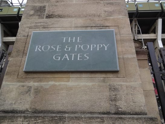 [left plaque] The Rose And Poppy Gates / Harry Gray 2016 / The Rose And Poppy Gates are dedicated to the memory of all rugby players who have served and died in conflicts around the world. / On the gates, bronze roses - as worn by generations of English rugby internationals - gradually transform into poppies, symbolising the move from player to soldier. / There are 15 large roses on each gate, representing the rugby team. They are modelled on those worn by the Grand Slam-winning England team of 1914, who all volunteered to fight for their country. / The brass poppies at the top of the gates are formed from German shell-casings fired in action during the 1914-1918 war. / The gates were unveiled in April 2016, as part of the RFU's programme of events to commemorate the centenary of the First World War. [centre plaque] The / Rose & Poppy / Gates [right plaque] The Rose And Poppy / Gates / Harry Gray 2016