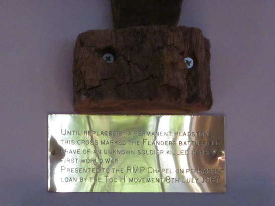 Grave marker:- GRU 7C17/ Plaque:- UNTIL REPLACED BY A PERMANENT HEADSTONE/ THIS CROSS MARKED THE FLANDERS BATTLEFIELD/ GRAVE OF AN UNKNOWN SOLDIER KILLED IN THE/ FIRST WORLD WAR./ PRESENTED TO THE R.M.P. CHAPEL ON PERMANENT/ LOAN BY THE TOC H MOVEMENT 8th JULY 1987