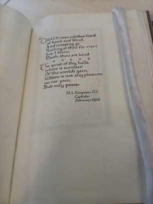Front Cover- ROLL OF HONOUR/OF THE OLD BOYS/OF CARLISLE/GRAMMAR SCHOOL/[school badge]/M.D. CCCCXIV/M.D. CCCCXVIII; Poem on the front inside page-Death, men call thee hard/of heart and blind,/And weeping go/Railing at thee for ever/but I know,/Death, thou art kind.//The quiet of thy halls,/where is surcease/Of the world's gain,/Where is not any pleasure;/no, nor pain./But only peace.//H.L. Simpson, O.C./Carlisle/February 1916; Title Page-ROLL OF/HONOUR/OLD BOYS/OF CARLISLE/GRAMMAR/SCHOOL/Who fell in the war of/1914 1918/PRO PATRIA; Pages 1 to 45- [names, 2 per page with much biographical detail]