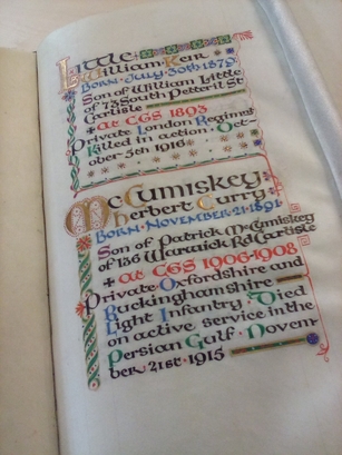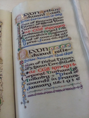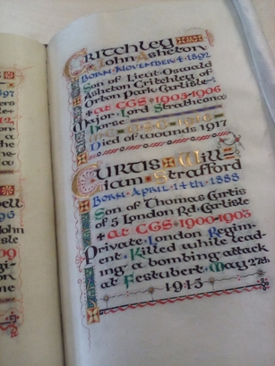 Page 1- Abram/Robert/Born September 21 1891/Son of Thomas Abram/of Currock, Carlisle/at CGS 1904-1911/Captain Border Regim-/ent. Killed in action/at Gheluvelt, Flan-ders October 28th 1917; Atkinson/Reginald John/Born January 3rd 1898/Son of Thomas Atkinson/of Bowness-on-Solway/at CGS 1914-1916/Private Liverpool Reg-iment Killed in Action/near Armentieres/France June 3rd 1917; Page 2-Ballantyne/George Newell/Born August 14th 1894/Son of W N Ballantine/of St Howard Pl. Carlisle/at CGS 1903-1909/Private Manchester/Regiment. Killed in/action in Gallipoli/August 7th 1915; Barton/Bertie Bowman/Born February 10 1884/Son of Thomas Barton/of Carlisle/at CGS 1893-1898/Lance Corporal-The/King's Royal Rifle/Corps. Killed in action/at Cambrai Novem/ber 30th 1917; Page 3-Batey/James Herbert/Born November 6th 1893/Son of James Batey/of 37 English Street/Longtown/at CGS 1907-1908/Corporal Gordon High-/landers Killed in ac/tion at Festubert/France May 16th 1915; Beeby/Richard/Born June 14th 1891/Son of Richard Beeby/of 60 Broad St. Carlisle/at CGS 1904-1907/Private Australian/Imperial Forces/Died of wounds in/France May 9th 1918; Page 4-Bell Francis/Richard Lowry/Born August 27th 1891/Son of Francis Bell of/Inglewood House/Hesket-in-the-Forwest/at CGS 1904-1909/Lieutenant Border Regiment killed in/action at Amiens/near Albert, France/February 22nd 1916; Bott George/Born September 30 1886/Son of the Rev Richard/Bott Vicar of Cotehill/at CGS 1897-1906/Second Lieutenant/Rifle Brigade Killed/in action in France/February 9th 1917; Page 5- Bremner/Alastair Bruce/Born May 27th 1884/Son of William Brem-/ner Manager of the/Clydesdale Bank, Carlisle/at CGS 1893-1896/Captain Northern Rhod-/esian Military Police/Died at Livingstone N./Rhodesia Jan 1 1918 the/result of an accident; Bremner Hunt-/ly William Bruce/Born.., 1880/Son of William Bremner/Manager of the Clydes-/dale Bank Carlisle/at CGS 1889-1896/Private The London Scot-/ish Regiment Killed in/action at Gommecourt/on the Somme July 1st 1916; Page 6-Caird/James Robert/Born November 41892/Son of Major Lindsay/Henryson Caird of/Warwick Sq Carlisle/at CGS 1901-1911/Captain Kings Own/Scottish Borderers/Killed in action at St/Julien near Ypres/April 23rd 1915; Calvert/Robert Mayson/Born March 1st 1896/Son of Robert Calvert/of Burgh-by-Sands/at CGS 1903 1910/Second Lieutenant/Manchester Regim-/ent Killed in action/July 9th 1916; Page 7- Campbell/John Santiago/Born July 25th 1891/Son of Archibald Campbell/of Barrow-in-Furness/at CGS 1904-1907/Captain Royal Flying/Corps Killed while fly-/ing in France Septem-/ber 28th 1917; Carrick/Laurence Stanley/Born January 26th 1882/Son of John Carrick of/The Grange Brampton/at CGS1892-1896/Lieutenant Canadian/Infantry Killed in ac-/tion at Courcelette/September 15th 1916; Page 8- Carruthers/Henry Senior/Born January 10th 1897/Son of Joseph Carruthers/of 55 Rickergate, Carlisle/at CGS 1909-1912/Rifleman County of Lon-/don Regiment. Died a /prisoner of war of the/Germans behind the/firing line in Russia/April 6th 1917; Cheverton/Stanley Campbell/Born March 22nd 1896/Son of Capt. Francis John/Cheverton R.A. of Carlisle/at CGS 1905-1909/Lieutenant Border Regi-/ment Killed in action/at Les Boeufs Somme/January 27th 1917; Page 9- Critchley/John Asheton/Born November 4th 1892/Son of Lieut Oswald/Asheton Critchley of/Orton Park Carlisle/at CGS 1905-1906/Major Lord Strathcona's/Horse/M.C. D.S.O. 1916/Died of wounds 1917; Curtis Will-/iam Strafford/Born April 14th 1888/Son of Thomas Curtis/of 5 London Rd Carlisle/at CGS 1900-1903/Private London Regim-/ent Killed while lead-/ing a bombing attack/at Festubert May 27th/1915; Page 10- Curwen/Edward Stanley/Born January 1st 1879/Son of the Rev Edward/Hasell Curwen/Rector of Plumbland/at CGS 1891-1898/Private York & Lancas/ter Regiment Killed in/action on the Somme/July 1st 1916; de Glanvillr/Robert/Born October 18 1896/Son of Oscar de Glan-/ville of Rangoon, Burma/at CGS 1912-1913/Private Cameron High-/landers Missing &/presumed killed/September 26th 1915; Page 11- Dixon Arthur/Edward Basil/Born September 26 1889/Son of Francis Peter/Dixon of Wood View/Carlisle/at CGS 1899-1903/Lieutenant Royal Nth/Lancashire Regiment/Died of wounds at/Ypres June 6th 1915; Dixon/Edward Leslie/Born August 23rd 1896/Son of Nichol Dixon/of 3 Lawn Terr Silloth/at CGS 1911-191/Corporal Durham Lgt/Infantry Died of/wounds in France/January 11th 1916; Page 12- Dixon/John/Born January 20 1890/Son of John Dixon of/St Ann's Hill, Carlisle/at CGS 1905-1909/Private Canadian Reg/iment Killed in ac-/tion at Vimy Ridge/France April 9th 1917; Dixon/Robert James/Born July 8th 1893/Son of Richard Dixon/of 24 Portland Place/Carlisle/at CGS 1907-1911/Lance Corporal Mid-/dlesex Regiment/Died at Lucknow/of enteric January/28th 1917; Page 13- Dixon/Peter Sydenham/Born January 12 1883/Son of Francis Peter Dixon/of Wood View, Carlisle/at CGS 1892-1897/Lieutenant Sussex Reg/iment Killed in action/at Heilly, France/August 7th 1918; Dobson/Nathaniel George/Born May 30th 1892/Son of Nathaniel/Smythe Dobson of/Rosehill, Harrington/at CGS 1904-1908/Lieutenant Cameron-/ians Died of wounds/in Rouen Hospital on/November 17th 1918; Page 14- Dodd Joseph/Born February 7th 1892/Son of William Dodd/of Gamblesby Langwathby/at CGS 1906-1908/Private Canadian Regt/Killed in action on the/Somme September 26th/1916; Dodgson/Edward Hughes/Born September 5th 1876/Son of Henry Dodgson/M.D. of Derwent House/Cockermouth/at CGS 1893-1995/Captain Border Regim-/ent Died at Casual-/ty Clearing Station/May 3rd 1918; Page 15- Dove/Charles Bertram/Born July 6th 1884/Son of Charles Dove/of Viewfield, Stanwix/at CGS 1894-1898/Captain Border Regim-/ent Killed in action/in France March 21st/1918; Farrour/Herbert Ronald/Born July 25th 1887/Son of the Rev. Herbert/William Farrour/formerly Vicar of St./James Carlisle/at CGS 1897-1898/Second Lieutenant/Manchester Regiment/Killed in action at/Wulvergheun Dec 24/1914; Page 16- Forster/Charles Cecil/Born August 10 1888/Son of 