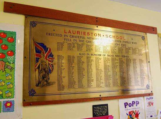 LAURIESTON SCHOOL/ERECTED IN GRATEFUL MEMORY OF THE FORMER PUPILS WHO/FELL IN THE GREAT WAR 1914 1919/[79 names in 11 columns]/ALSO IN HONOUR OF THOSE WHO SERVED/[334 names in 11 columns]