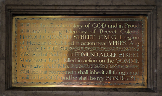 /TO THE GREATER GLORY OF GOD AND IN PROUD/AND LOVING MEMORY OF BREVET COLONEL/HAROLD EDWARD STREET. C.M.G., LEGION/OF HONOUR. R.A. KILLED IN ACTION NEAR YPRES. AUG./25TH A.D. 1917./AND OF 2ND LIEUT. EDMUND ALGER STREET./MANCHESTER REGT., KILLED IN ACTION ON THE SOMME/JUNE 2ND. A.D. 1916./quotation/