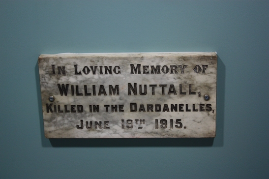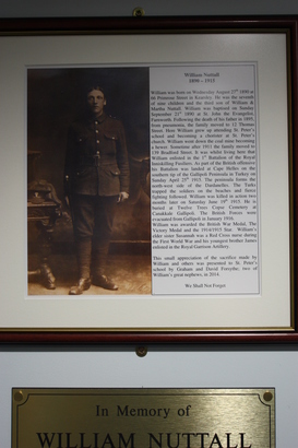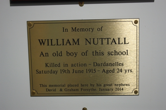 Original plaque - In loving memory of William Nuttall, Killed in the Dardanelles, June 19th 1915 New plaque - In Memory of William Nuttall An old boy of this school Killed in action - Dardenelles Saturday 19th June 1915 - Aged 24 years. This memorial placed here by his great nephews David & Graham Forsythe, January 2014 Framed ptograph and details of William Nuttall's life