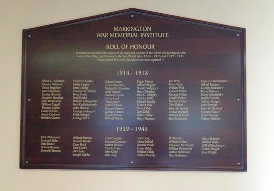 MARKINGTON / WAR MEMORIAL INSTITUTE / ROLL OF HONOUR / IN WHICH ARE INSCRIBED THE NAMES OF THE MEN AND WOMEN OF THE PARISH OF MARKINGTON WHO / SERVED THEIR KING AND COUNTRY IN THE TWO WORLD WARS 1914-1918 AND 1939-1945 / THOSE WHOSE NAMES WERE LAID DOWN ARE THUS SIGNIFIED + / 1914-1918 / (Names) / 1939-1945 / (Names)