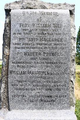To The Memory / of / FORT WILLIAM MEN / WHO LOST THEIR LIVES / IN THE SOUTH AFRICAN WAR 1899 - 1902 PTE. DAVID MACLAREN / LOVAT SCOUTS, MORTALLY WOUNDED, / QUAGGERSFONTEIN, 21ST SEPT. 1901. PTE. WALTER PRINGLE / LOVAT SCOUTS, / ACCIDENTALLY KILLED DURBAN VILLE, / BERG REIVER, 22TH DECR. 1901. WILLIAM MACNIVEN, M.B., CH,B,. EDIN. / CIVIL SURGEON, / SOUTH AFRICAN FIELD FORCE, / DIED ON H.M. TROOPSHIP PLASSEY, / SOUTHAMPTON 25TH JUNE 1902. ERECTED BY THE TOWNSPEOPLE / OF FORT WILIAM.