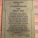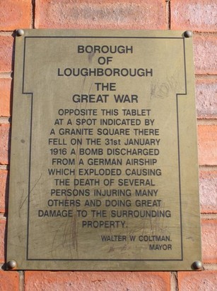 BOROUGH / OF LOUGHBOROUGH / THE GREAT WAR / OPPOSITE THIS TABLET / AT A SPOT INDICATED BY / A GRANITE SQUARE THERE / FELL ON THE 31st JANUARY / 1916 A BOMB DISCHARGED / FROM A GERMAN AIRSHIP / WHICH EXPLODED CAUSING / THE DEATH OF SEVERAL / PERSONS INJURING MANY / OTHERS AND DOING GREAT / DAMAGE TO THE SURROUND /ING PROPERTY. / WALTER W. COLTMAN. / MAYOR.