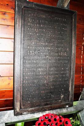 (ON GATE) TO THE GLORY OF GOD/ AND/ IN MEMORY/ OF/ THE MEN OF THIS PARISH/ WHO FELL IN THE GREAT WAR (ON BOARD) TO JESUS OUR (PATTERN?)/ AND IN REVERANT AND LOVING/ MEMORY OF THOSE OUR SONS/ AND BROTEHRS WHO IN THE/ HOUR OF THEIR COUNTRY'S/ PEIL SET THE SAFETY OF THEIR/ OWN LIVES AND DIED IN THE/ 1914 GREAT WAR 1918/ (NAMES) THIS GATE IS DEDICATED IN REMEMBRANCE/ (ILLEGIBLE) OF PENRHOS CHURCH/ THEY WERE A WALL UNTO US BOTH BY/ NIGHT AND DAY