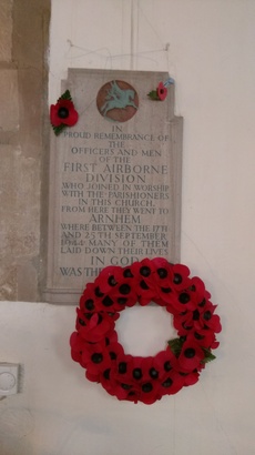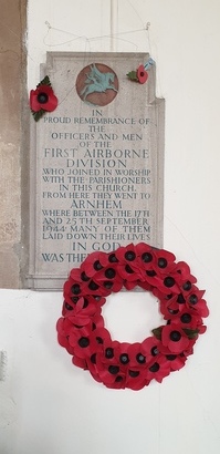 IN PROUD REMEMBRANCE OF THE OFFICERS AND MEN OF THE FIRST AIRBORNE DIVISION WHO JOINED IN WORSHIP WITH THE PARISHIONERS IN THIS CHURCH. FROM HERE THEY WENT TO ARNHEM WHERE BETWEEN THE 17TH AND 25TH SEPTEMBER 1944 MANY OF THEM LAID DOWN THEIR LIVES IN GOD WAS TH*************