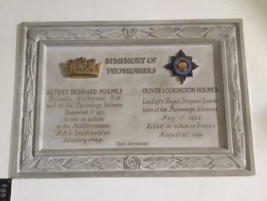 UPPER PART: IN MEMORY OF / TWO BROTHERS LEFT SIDE: ALFRED BERNARD HOLMES / PAYMASTER MIDSHIPMAN R.N. / BORN AT THE PARSONAGE UDIMORE / DECEMBER 5TH 1921 / KILLED IN ACTION / IN THE MEDITERRANEAN / H.M.S. SOUTHAMPTON / JANUARY 11TH 1941 RIGHT SIDE: OLIVER LOCKINGTON HOLMES / LIEUT. 4/7TH ROYAL DRAGOON GUARDS / BORN AT THE PARSONAGE UDIMORE / MAY 17TH 1923 / KILLED IN ACTION IN FRANCE / AUGUST 28TH 1944 LOWER PART: QUIS SEPARABIT