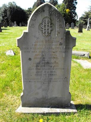 In Loving Memory of / JOHN WILLIAM / THE BELOVED SON OF / JOHN WILLIAM & CHARLOTTE GREEN / WHO WAS ACCIDENTALLY KILLED / MAY 23, 1918 / AGED 28 YEARS / ALSO OF ALFRED / THEIR BELOVED SON / WHO WAS KILLED IN ACTION / JULY 2ND 1915 / AGED 22 YEARS / THY PURPOSE LORD WE CANNOT SEE, BUT ALL IS WELL, THAT’S DONE BY THEE.
