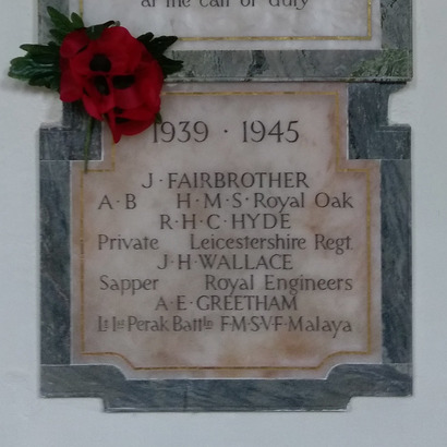 1939 - 1945 J Fairbrother AB HMS RoyalOak RHC Hyde Private Leicestershire Regiment J H Wallace Sapper Royal Engineers A E Greetham Lt 1st Perak Battn FMSVF Malaya