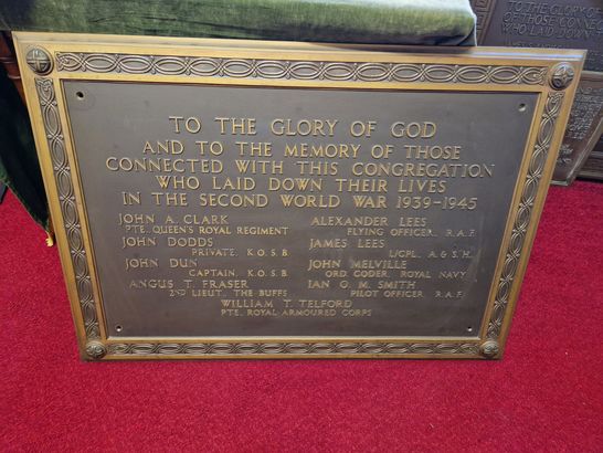 TO THE GLORY OF GOD/AND TO THE MEMORY OF THOSE/CONNECTED WITH THIS CONGREGATION/WHO LAID DOWN THEIR LIVES/IN THE SECOND WORLD WAR 1939-1945/[names in 2 columns]