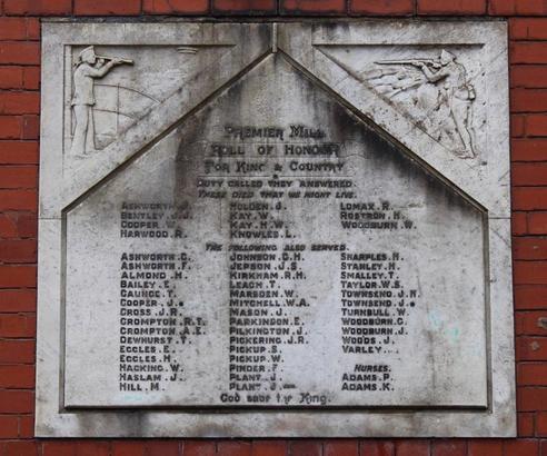 PREMIER MILL / ROLL OF HONOUR / FOR KING & COUNTRY / DUTY CALLED THEY ANSWERED. / THESE DIED THAT WE MIGHT LIVE. / (Names) / THE FOLLOWING ALSO SERVED / (Names) / NURSES / (Names) / GOD SAVE THE KING