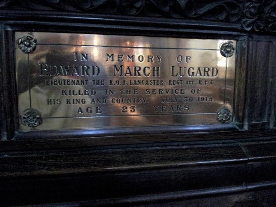 IN MEMORY OF EDWARD MARCH LUGARD LIEUTENANT THE K.O.R REGT. ATT. R.F.C KILLED IN THE SERVICE OF HIS KING AND COUNTRY JUNE 30 1918 AGE 23 YEARS