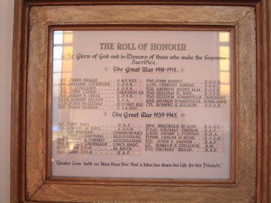 THE ROLL OF HONOUR/To the Glory of God and in Memory of those who made the Supreme /Sacrifice/The Great War 1914-1918/[15 names in 2 columns]/The Great War 1939-1945/[14 names in 2 columns]/'Greater Love hath no man than this that a Man lay down his Life for his Friends'