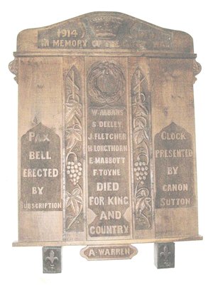 1914 1919/ IN MEMORY OF THE GREAT WAR/ PAX/ BELL/ ERECTED/ BY/ SUBSCRIPTION/ (Names)/ DIED/ FOR KING/ AND/ COUNTRY/ CLOCK/ PRESENTED/ BY/ CANON/ SUTTON/ (Name)