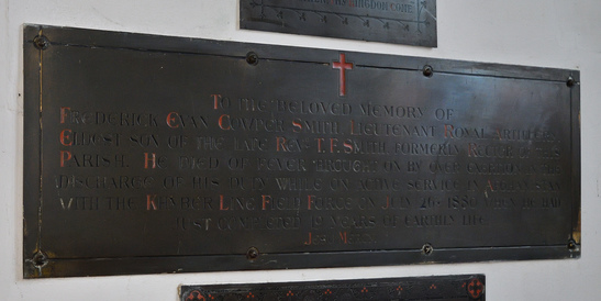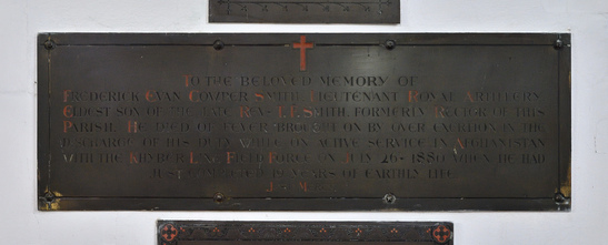 †/ TO THE BELOVED MEMORY OF/ FREDERICK EVAN COWPER SMITH. LIEUTENANT ROYAL ARTILLERY./ ELDEST SON OF THE LATE REVD. T. F. SMITH. FORMERLEY RECTOR OF THIS/ PARISH. HE DIED OF FEVER BROUGHT ON BY OVER EXERTION IN THE/ DISCHARGE OF HIS DUTY WHILE ON ACTIVE SERVICE IN AFGHANISTAN/ WITH THE KHYBER LINE FIELD FORCE ON JULY 26TH 1880 WHEN HE HAD/ JUST COMPLETED 19 YEARS OFEARTHLY LIFE./ JESU MERCY.