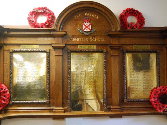 The middle section has the inscription "Pro Patria" and below are the arms of the school and on the middle plate the dedication: (original) Inscribed hereon, that they may be held in proud remembrance by those who come after, are the names of old boys of this school who fell in the Great War, 1914-1918 (2018) In proud remembrance of Old Parmiterians who fell in two Great Wars and Afghanistan addition