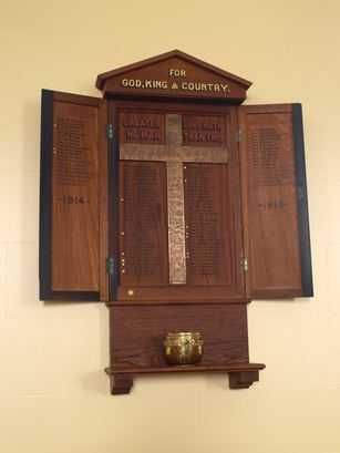Top Centre- FOR GOD, KING & COUNTRY Left Hand Door-ROLL OF HONOUR/[names]/1914 Right Hand Door-ROLL OF HONOUR/[names]/1918 Either Side of the Central Cross- GREATER LOVE HATH/NO MAN THAN THIS/[names]