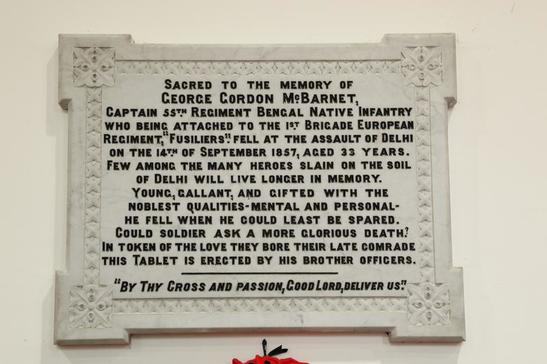 SACRED TO THE MEMORY OF / GEORGE GORDON McBARNET, / CAPTAIN 55TH REGIMENT BENGAL NATIVE INFANTRY / WHO BEING ATTACHED TO THE 1ST BRIGADE EUROPEAN / REGIMENT, "FUSILIERS" FELL AT THE ASSAULT OF DELHI / ON THE 14TH OF SEPTEMBER 1857, AGED 33 YEARS. / FEW AMONG THE MANY HEROES SLAIN ON THE SOIL / OF DELHI WILL LIVE LONGER IN MEMORY. / YOUNG, GALLANT, AND GIFTED WITH THE / NOBLEST QUALITIES - MENTAL AND PERSONAL - / HE FELL WHEN HE COULD LEAST BE SPARED. / COULD SOLDIER ASK A MORE GLORIOUS DEATH? / IN TOKEN OF THE LOVE THEY BORE THEIR LATE COMRADE / THIS TABLET IS ERECTED BY HIS BROTHER OFFICERS. / "BY THY CROSS AND PASSION, GOOD LORD, DELIVER US."