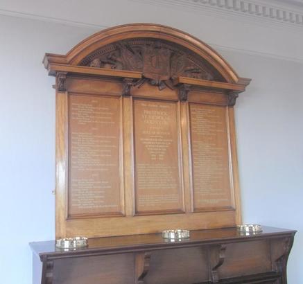 1915 / (Names) / 1916 / (Names) / 1917 / (Names) / PRO PATRIA MORTUI / PRESTWICK / ST. NICHOLAS / GOLF CLUB / ROLL OF HONOUR / MEMBERS AND THE SONS OF/ MEMBERS WHO FELL IN / ACTION OR DIED OF / WOUNDS IN THE / GREAT WARS. / 1914 - 1918 / 1939 - 1945 / (Names)/ " SO THEY GAVE THEIR BODIES TO THE COMMONWEALTH, AND / RECEIVED, EACH FOR HIS OWN MEMORY, PRASIE THAT WILL NEVER / DIE, AND WITH IT, THE GRANDEST OF ALL SEPULCHRES, NOT THAT IN / WHICH THEIR MORTAL BONES ARE LAID, BUTA HOME IN THE MINDS / OF MEN." - THUCYDIDES.11.43.