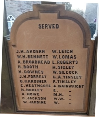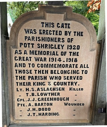 This gate was erected by the parishioners of Pott Shrigley 1920 as a memorial of the Great War 1914 - 1918 and to commemorate all those then belonging to the parsh who served their King & Country. Lt. H S Aslachsen killed. Lt. T B Lowther, killed. Cpl. J J Greenhough, killed. Pte. A Barton, wounded. Pte. J H Dodd, wounded. Pte. J T Harding, wounded. Served. J H Ardern, W H Bennett, A Broadhead, H Booth, H Downes, J H Forrest, C Gardiner, C Heathcote, H Hooley, A Howe, G Jackson, W Jardine, W Leigh, W Lomas, L Roberts, H Sigley, W Silcock, G A Tinsley, A Wainwright, E Wainwright, M H Wainwright, W W Wainwright, W Wainwright.