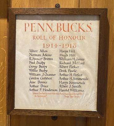 PENN, BUCKS. / ROLL OF HONOUR / 1914-1918 / (Names) / GREATER LOVE HATH NO MAN THAN THIS, THAT A MAN LAY DOWN HIS LIFE / FOR HIS FRIENDS / VIVIAN HYDE. SCRIPSIT