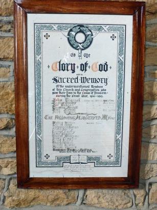 TO THE / GLORY OF GOD / AND IN / SACRED MEMORY / OF THE UNDERMENTIONED MEMBERS / OF THIS CHURCH AND CONGREGATION WHO /GAVE THEIR LIVES IN THE CUASE OF FREEDOM / DURING THE GREAT WAR, 1914-1919 /(Names) / THE FOLLOWING ALSO SERVED IN HM FORCES / (Names) / GREATER LOVE HATH NO MAN THAN THIS / THIS SCROLL / WAS PLACED IN SUTTON UNDER BRAILES / PARISH CHURCH AFTER THE CLOSURE OF SUTTON METHODIST CHAPEL & DEDICATED IN 1986 / REMEMBRANCE SUNDAY