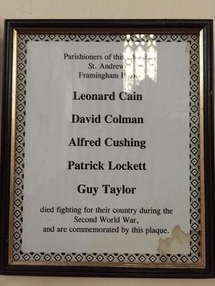 PARISHONERS OF THIS CHURCH / ST. ANDREW / FRAMINGHAM PIGOT / (Names) / DIED FIGHTING FOR THEIR COUNTRY DURING THE / SECOND WORLD WAR, / AND ARE COMMEMORATED BY THIS PLAQUE.