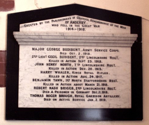 Major George Budibent Army Service Corps/Died Oct 2 1918/ 2nd Lieut Cecil Budibent 2nd Lincolnshire Regt/Killed in Action Sept 25 1915/ John Henry North 7th Lincolnshire Regt/Killed in Action Dec 20 1915/ Harry Whaler Kings Royal Rifles/Killed in Action Aug 24 1917/ Benjamin Tawn 1st North Staffordshire Regt/Killed in Action About March 21 1918/ Robert Nash Briggs 2nd Lincolnshire Regt/Died a Prisoner in Germany Dec 11 1918/ Thomas Roger Brough Royal Garrison Artillery/Died on Active Service Jan 2 1919