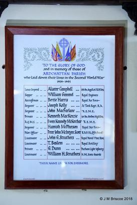 TO THE GLORY OF GOD/AND IN MEMORY OF THOSE OF/ARDCHATTAN PARISH/WHO LAID DOWN THEIR LIVES IN THE SECOND WORLD WAR/1939-1945/[NAMES]/THEIR NAME LIVETH FOR EVERMORE
