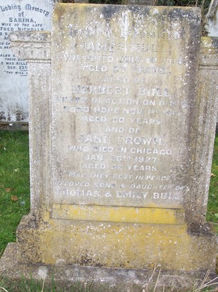 In / Loving Memory of/ JAMES BULL/ WHO DIED JULY 1ST 1914/ AGED 27 YEARS./ ALSO OF/ HERBERT BULL/ KILLED IN ACTION ON HMS/ GOOD HOPE NOV. 1ST 1914/ AGED 30 YEARS/ AND OF/ JANE BROWN./ WHO DIED IN CHICAGO/ JAN. 26TH 1927. AGED 32 YEARS/ “MAY THEY REST IN PEACE.”/ BELOVED SONS & DAIGHTER OF/ THOMAS & EMILY BULL