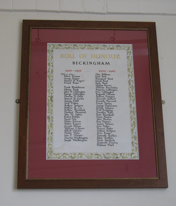 ROLL OF HONOUR/ BECKINGHAM/ 1914-1918 / Killed in action/(Names)/ 1939-1945/ (Names)