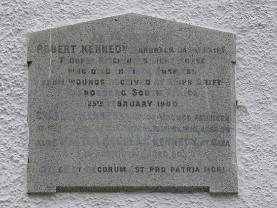 In loving memory of/Robert Kennedy, Marbrack Carsphairn/Trooper Kitcheners Light Horse/Who died in Field Hospital/From wounds received at Klips Drift/Paardeberg South Africa/25th February 1900/ Charles Kennedy died of wounds received/At the Battle of the Somme 16th Nov 1916 aged 35/ Also Walter Douglas Kennedy at Gaza/19th April 1917 aged 30/ Dulce et Decorum est pro Patria mori