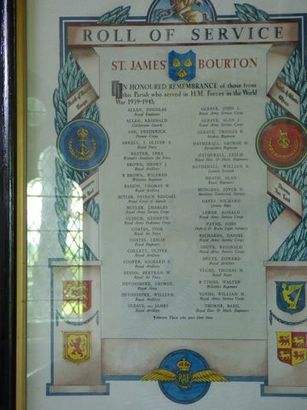 ROLL OF SERVICE / ST. JAMES' BOURTON / IN HONOURED REMEMBRANCE of those from / this Parish who served in H.M. Forces in the World / War 1939 - 1945. / (37 NAMES in two columns)