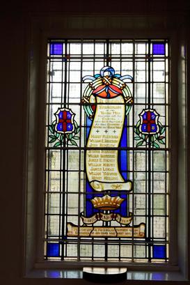 In Grateful/ Remembrance/ of the/ Young Men/ Associated with this/ Chapel/ who Gave their Lives/ for their Country/ During the Great War/ Names/ Freedom and Justice/ Ye that live on Mid English Pastures Green/ Remember us and Think What Might Have Been In the shields with side: 1914 1918
