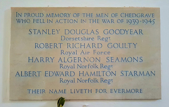 IN PROUD MEMORY OF THE MEN OF CHEDGRAVE / WHO FELL IN ACTION IN THE WAR OF 1939-1945 / (Names) / THEIR NAME LIVETH FOR EVERMORE //