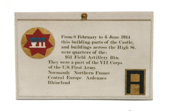 From February to 6 June 1944 this building, parts of the castle and other buildings across the High Street were quarters of the 951st Field Artillery Btn. They were part of the U.S. First Army. Normandy. Northern France. Central Europe. Ardennes. Rhineland.