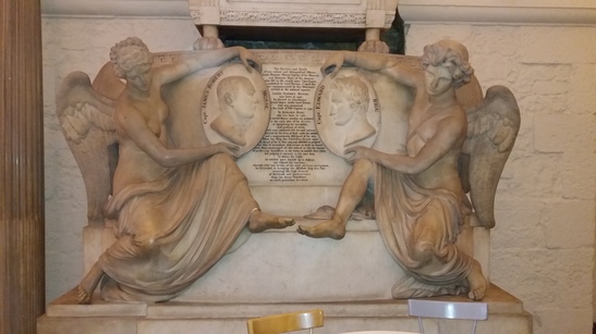 'The Services and Death / of two valiant and distinguished Officers. JAMES ROBERT MOSSE, Captain of the Monarch / and EDWARD RIOU of the Amazon / fell in the attack upon Copenhagen / conducted by Lord Nelson 2nd April 1801 / are commemorated by this Monument/erected at the national expense. / JAMES ROBERT MOSSE was born in 1746 / served as a Lieutenant / several years under Lord Howe / and was promoted to the rank of Post Captain in 1790. / To EDWARD RIOU who was born in 1762 / an extraordinary occasion was presented / in the early part of his service, / of signalizing his intrepidity / and presence of mind / which were combined with the most anxious / solicitude for the lives of those under his command / with a magnanimous disregard for his own. / When his Ship, the Guardian struck upon / an island of Ice, in Dec. 1789 and afforded no prospect. / but that of immediate destruction to those on board, / Lieut Riou encouraged all those who desired to take the chance / of preserving themselves in the boats to consult their safety / but judging it contrary to his own duty / to desert the Vessel / he neither gave up to despair / nor relaxed his exertions; / whereby after ten weeks of the most perilous navigation / he succeeded in bringing his disabled Ship into Port / receiving this high reward / of fortitude and perseverance / from the divine Providence / on whose protection he relied.' [Round portraits] 'Capt JAMES ROBERT MOSSE' 'Capt EDWARD RIOU'