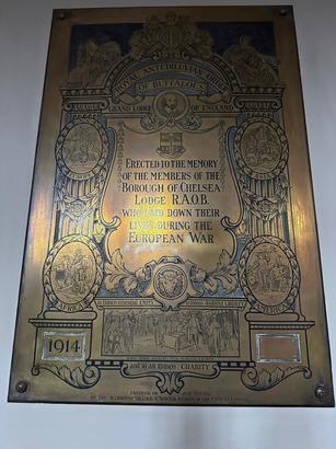 ROYAL ANTEDILUVIAN ORDER / OF BUFFALOES / GRAND LODGE / OF ENGLAND // ERECTED TO THE MEMORY / OF THE MEMBERS OF THE / BOROUGH OF CHELSEA / LODGE R.A.O.B. / WHO LAID DOWN THEIR / LIVES DURING THE / EUROPEAN WAR // in things essential UNITY / in things doubtful LIBERTY // KING JOHN SIGNING THE MAGNA CHARTA //1914 / 1918 // and in all things CHARITY // UNVEILED ON JULY 22ND 1917 / BY BRO ALDERMAN SIR LOUIS A. NEWTON SHERIFF OF THE CITY OF LONDON