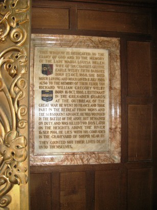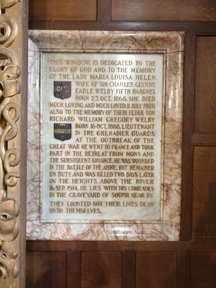 THIS WINDOW IS DEDICATED TO THE / GLORY OF GOD AND TO THE MEMORY / OF THE LADY MARIA LOUISA HELEN / WIFE OF SIR CHARLES GLYNNE / EARLE WELBY, 5TH BARONET. / BORN 23 OCT 1868 SHE DIED / MUCH LOVING AND MUCH LOVED 11 JULY 1920./ ALSO TO THE MEMORY OF THEIR ELDER SON / RICHARD WILLIAM GREGORY WELBY / BORN 16 OCT. 1888, LIEUTENANT / IN THE GRENADIER GUARDS./ AT THE OUTBREAK OF THE GREAT WAR HE WENT TO FRANCE AND TOOK / PART IN THE RETREAT FROM MONS AND THE SUBSEQUENT ADVANCE. HE WAS WOUNDED / IN THE BATTLE OF THE AISNE, BUT REMAINED / ON DUTY AND WAS KILLED TWO DAYS LATER / ON THE HEIGHTS ABOVE THE RIVER / 16 SEPT 1914. HE LIES WITH HIS COMRADES / IN THE GRAVEYARD OF SOUPIR NEAR BY. THEY COUNTED NOT THEIR LIVES DEAR / UNTO THEMSELVES.