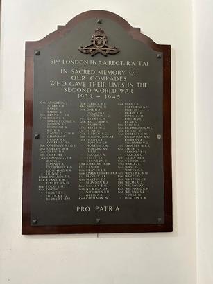 51ST LONDON HY. A.A. REGT R.A.(T.A.)/IN SACRED MEMORY OF/OUR COMRADES/WHO GAVE THEIR LIVES IN THE/SECOND WORLD WAR/1939-1945/[names in 3 columns]/PRO PATRIA