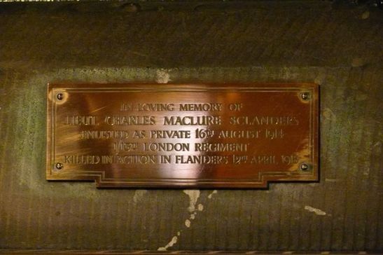 IN LOVING MEMORY OF/LIEUT. CHARLES MACLURE SCLANDERS/ENLISTED AS PRIVATE 16TH AUGUST 1914/1/13TH LONDON REGIMENT/KILLED IN ACTION IN FLANDERS 12TH APRIL 1918