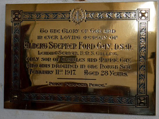 TO THE GLORY OF GOD AND/IN EVER LOVING MEMORY OF/ALBERT STEPHEN FORD GAY, D.S.M./LEADING SEAMAN. H.M.S. CULLIST,/ONLY SON OF CHARLES AND MINNIE GAY,/WHO WAS DROWNED IN THE NORTH SEA,/FEBRUARY 11TH 1917. AGED 28 YEARS./"PEACE PERFECT PEACE"